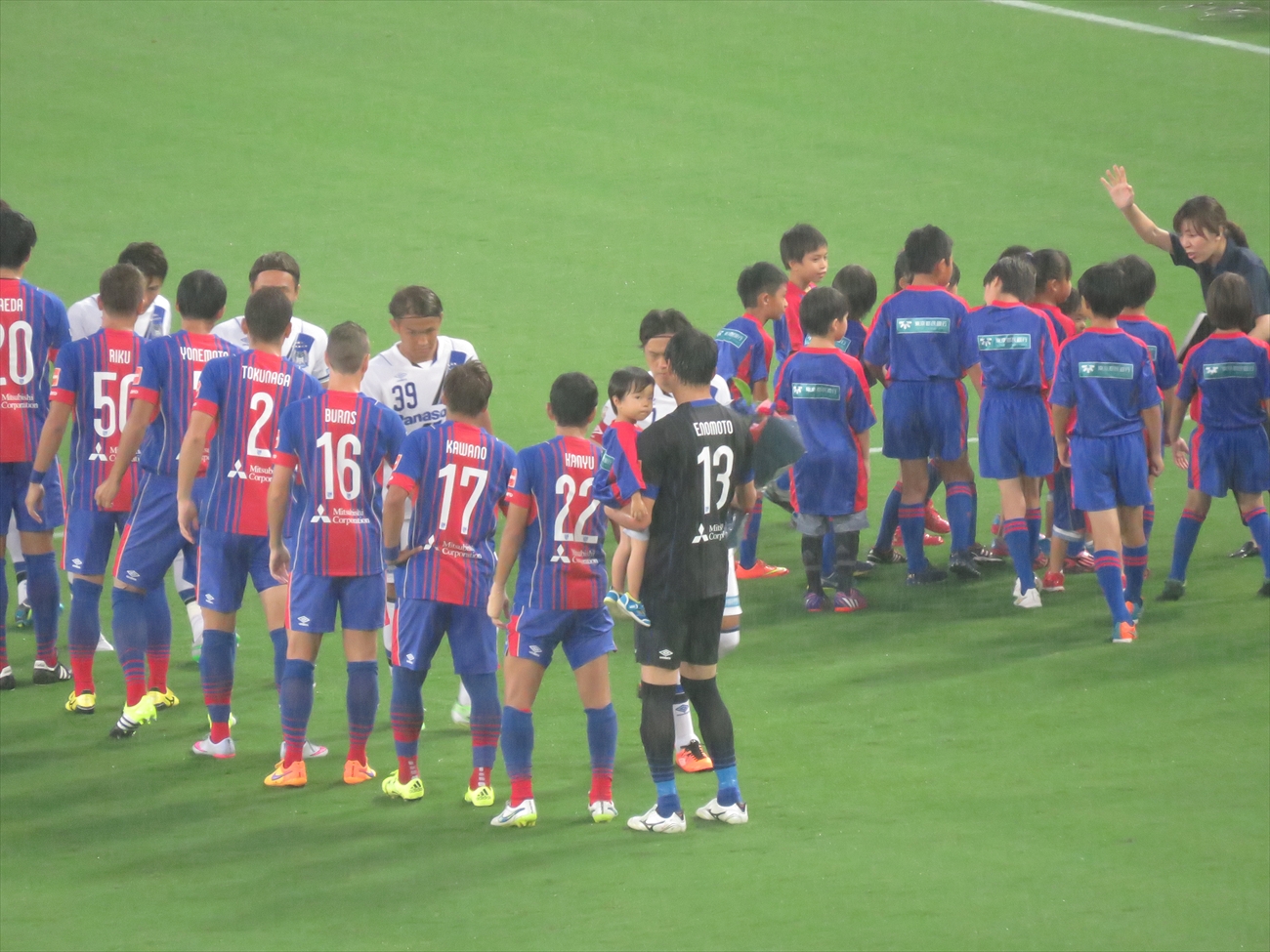相手選手との握手の後、一番後ろに並んでいたグランパス師匠にタッチしてにっこり。 ちなみにグランパス師匠はこの後の選手みんなに握手を求めるも...